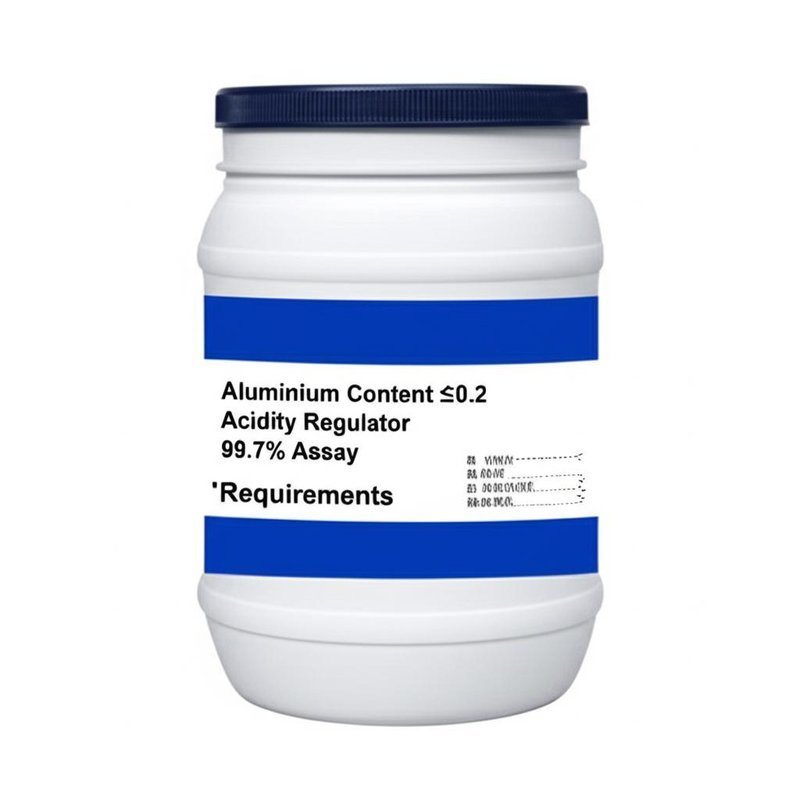 Eines der wichtigsten Produktmerkmale des RZBC Acidity Regulator ist seine Zertifizierung, einschließlich BP, USP, FCC und E330. Dies stellt sicher, dass das Produkt internationale Standards für Qualität und Sicherheit erfüllt. Der niedrige Aluminiumgehalt von ≤0,2 trägt zusätzlich zu seiner Attraktivität bei und macht es zu einer bevorzugten Wahl für verschiedene Industrien.